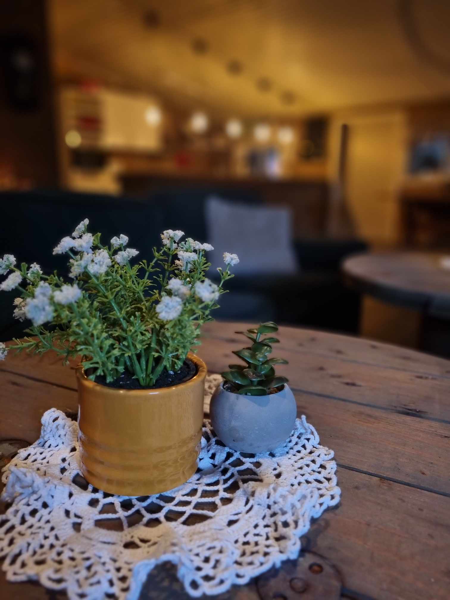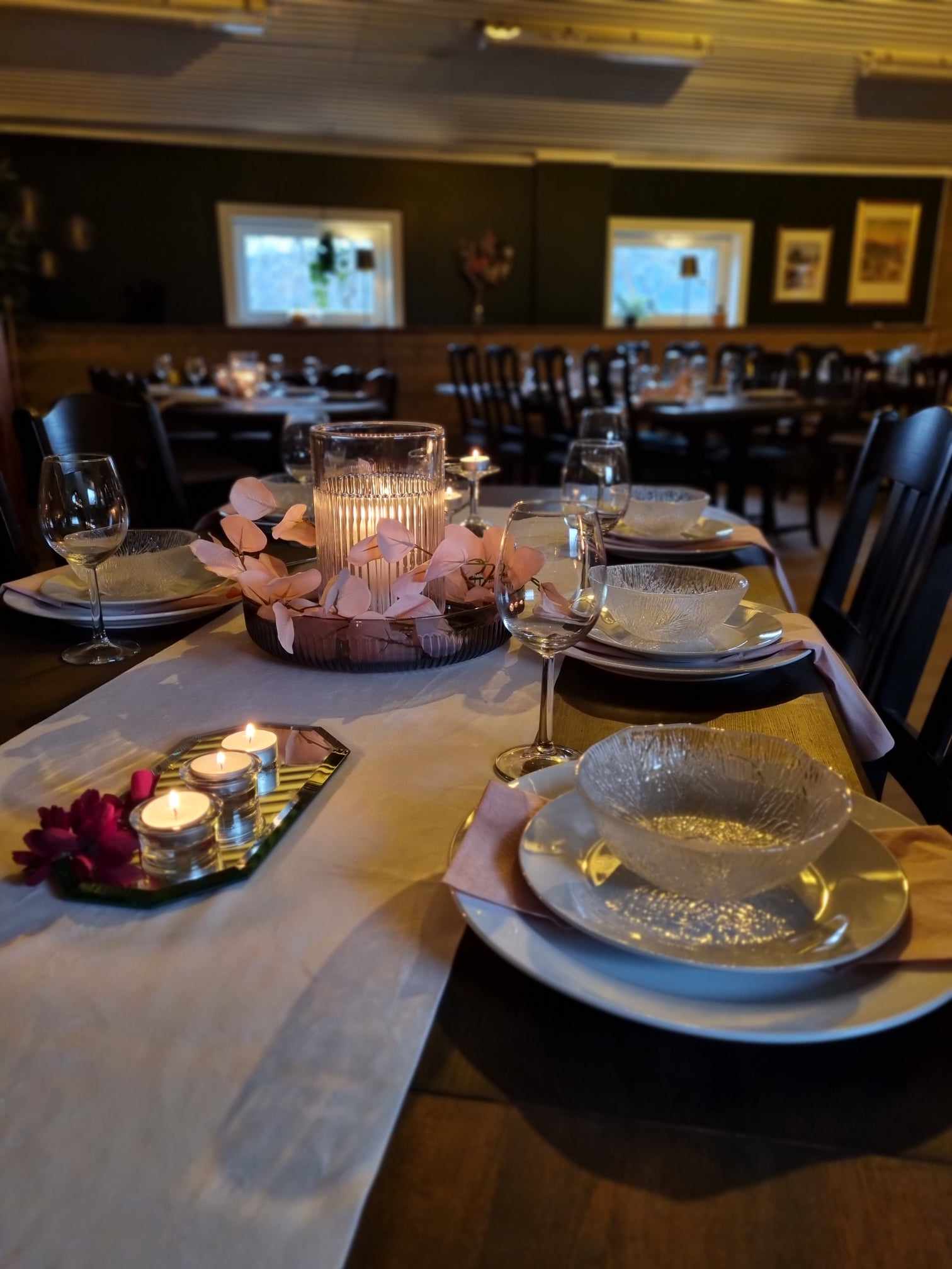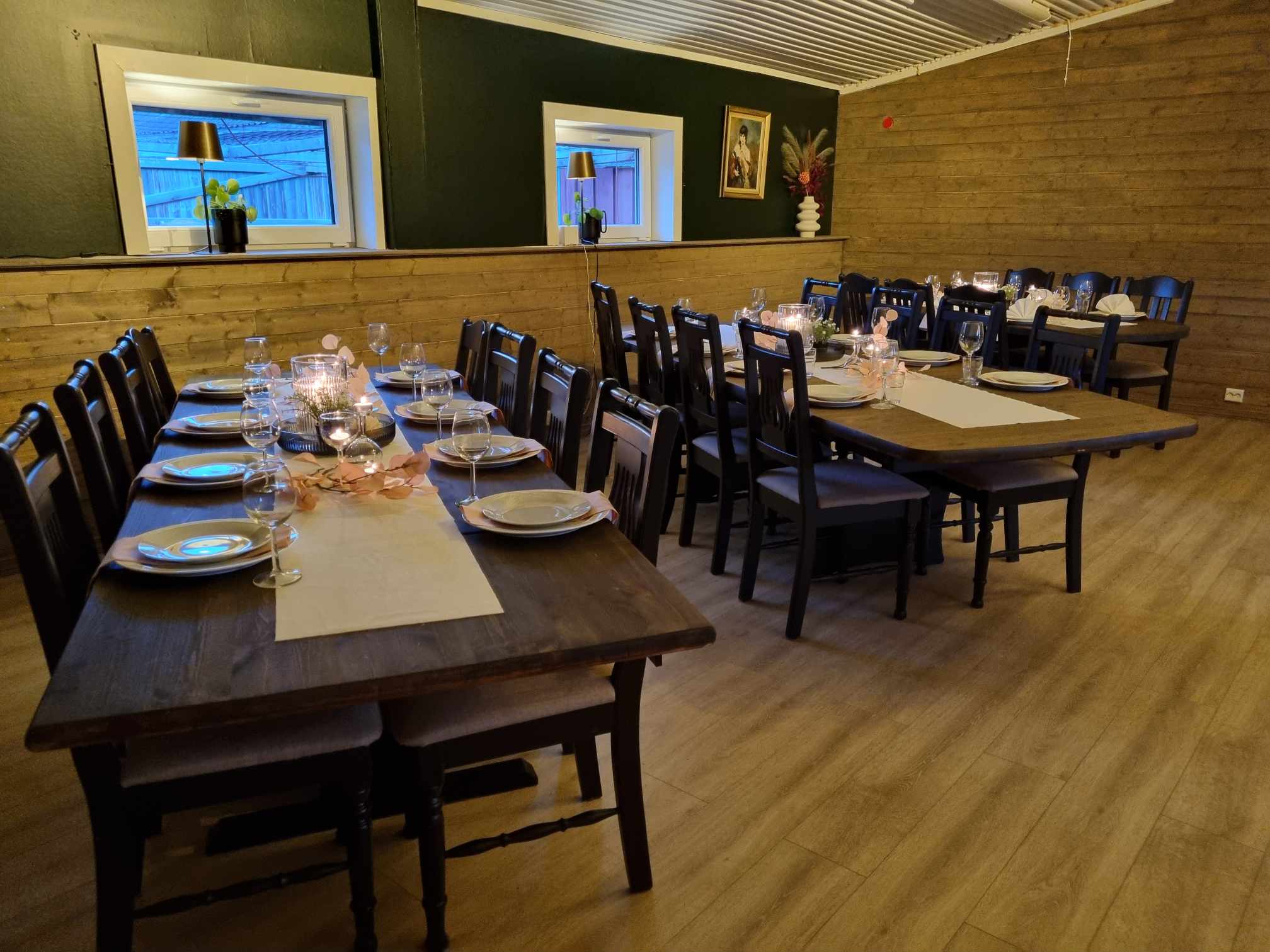 Her har vi bord og stoler til ca 50 stk. Her kan du flytte bordene til ditt ønske. Vi har noe vaser og lysholdere som er disponibelt ved leie, men ikke pynt og duker.