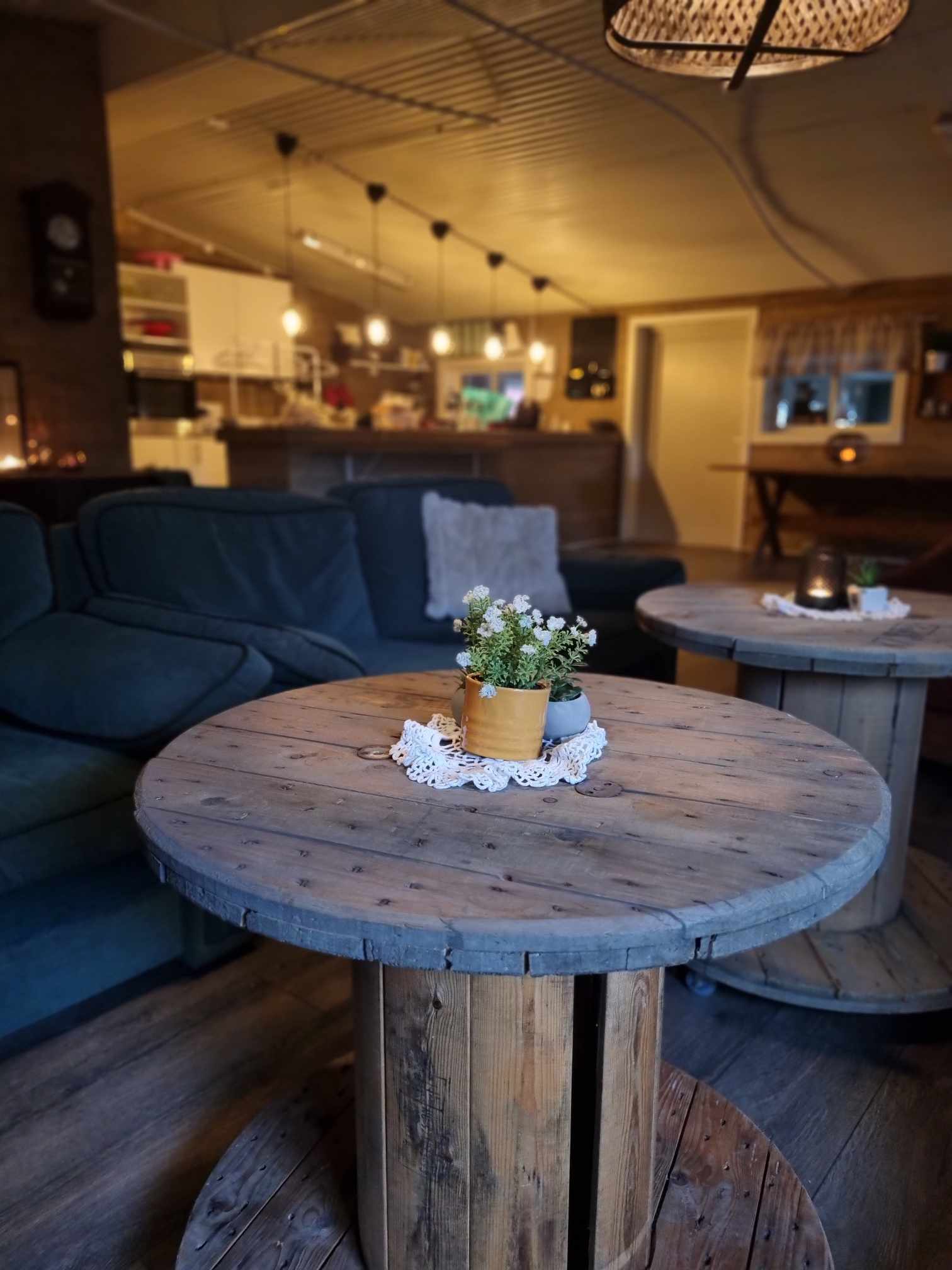 I stuen er det 4 stk 3 seter sofaer og en lenestol, med kabeltromler til bord. Et langt bord som kan brukes til enten buffe/gavebord eller lignende og et spisebord.